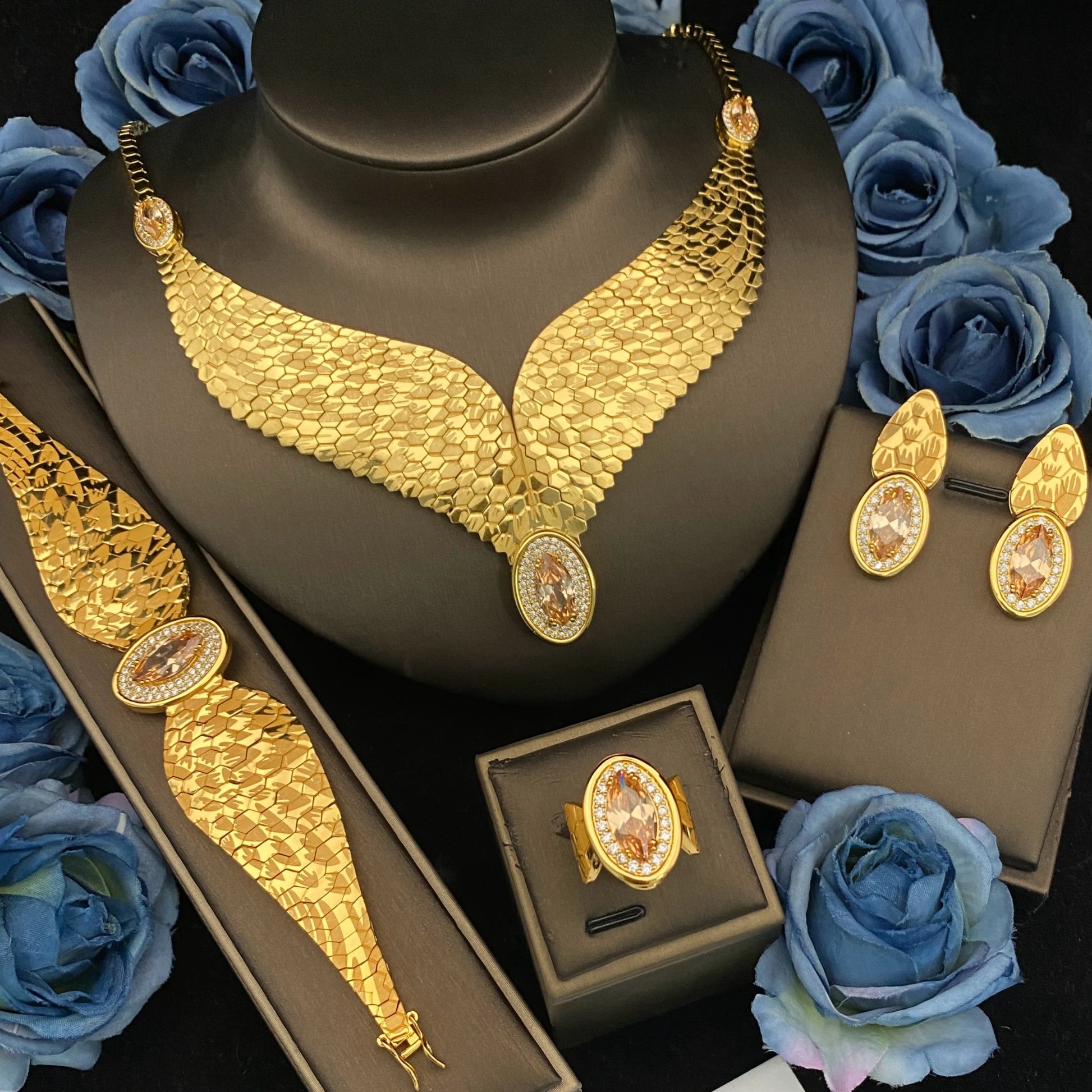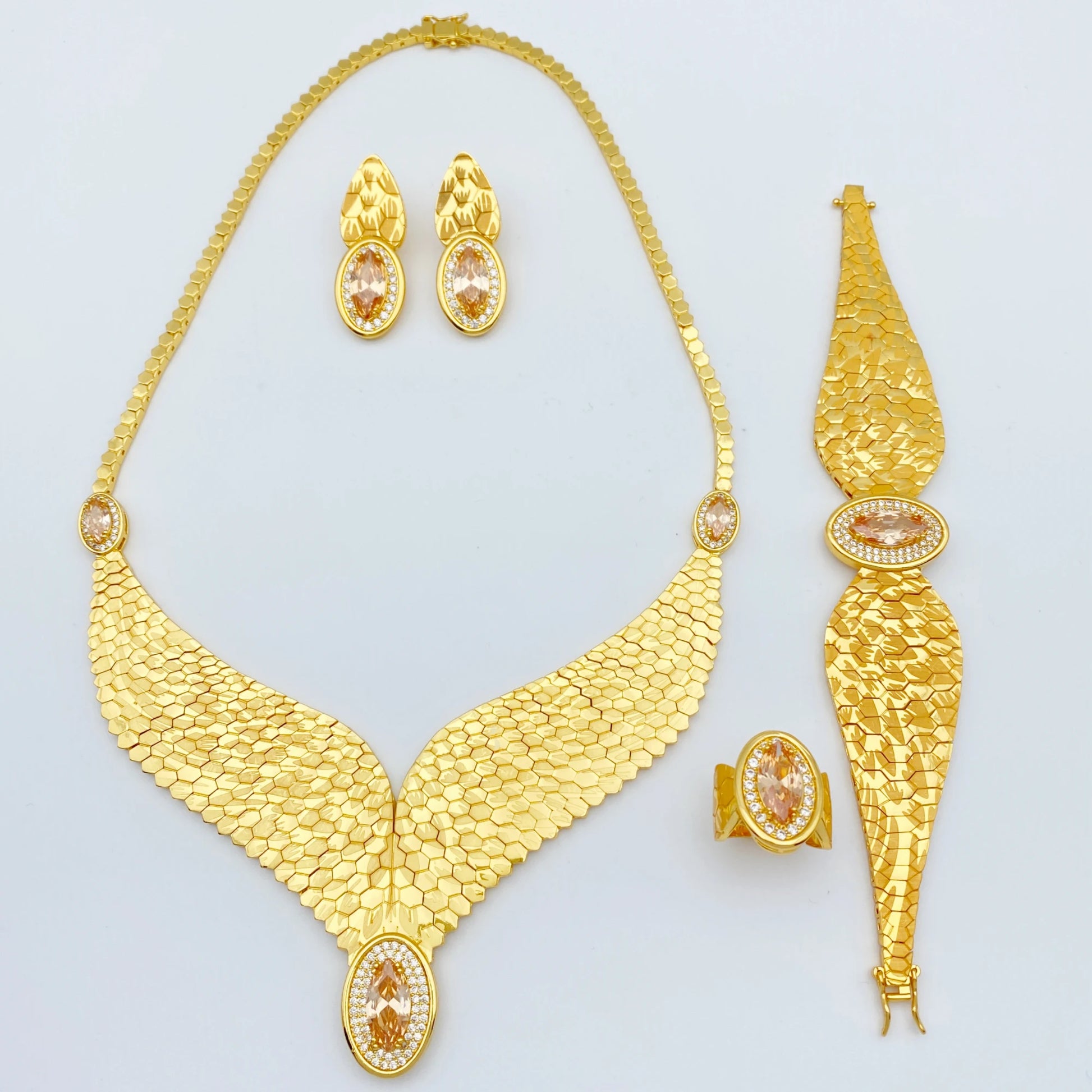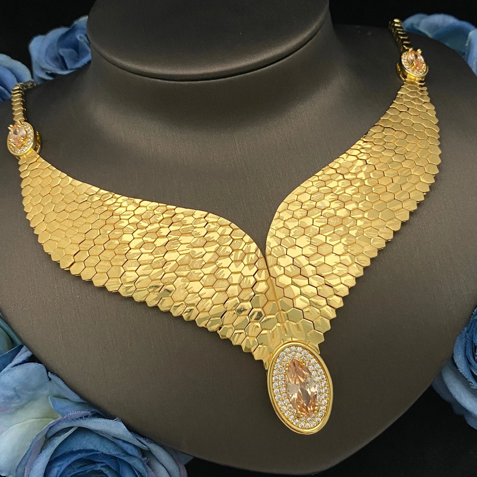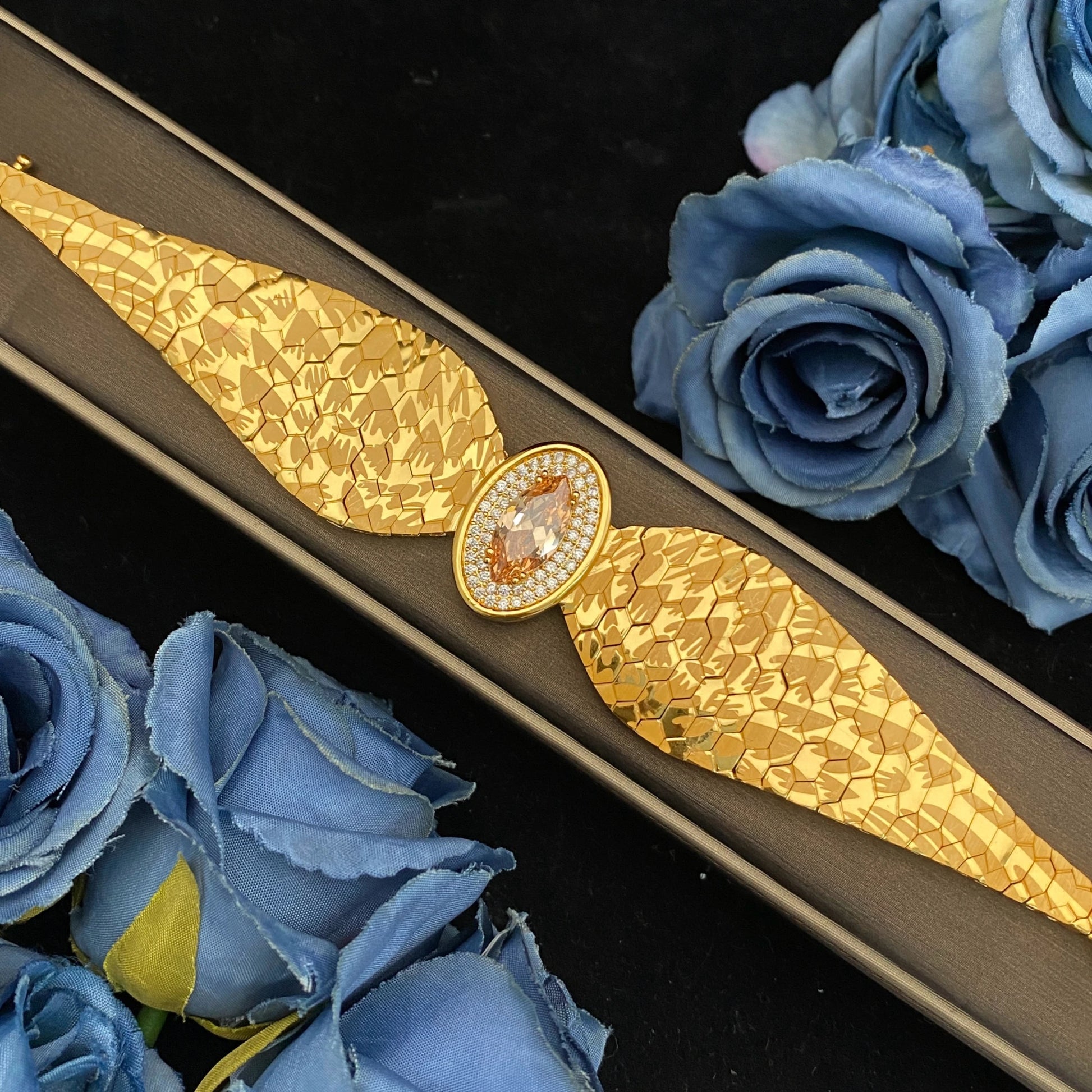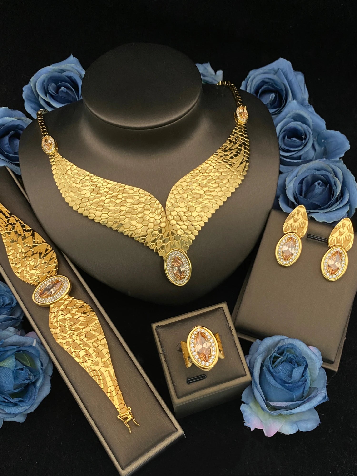 This Flora Golden Wings Jewellery Set is a stunning 4-piece collection featuring a necklace, earrings, bracelet, and ring, all adorned with sparkling yellow zirconia stones. Each piece is designed with delicate wing motifs, symbolizing elegance, freedom, and grace.